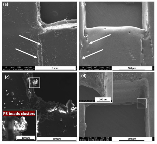 To verify whether non-specific binding was presented, 1 μm and 10 μm polystyrene (PS) beads (Sigma-Aldrich Inc., Seoul, Republic of Korea) were introduced into the microchannels. In Figure 6c, a large number of PS beads were concentrated at the interface of the microchannel regions. Obvious PS bead clusters were observed at the corner regions. Presumably, this resulted from the rough surface of the melted Parafilm® and PMMA, which was caused by unequal heat distribution during the fabrication process [20]. After hydrophobic treatment, PS beads presented a more scattered distribution as shown in Figure 6d. The SEM images revealed that the surface roughness was largely improved.
