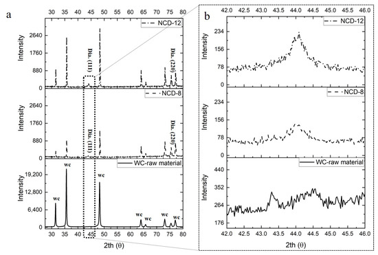 XRD analysis results: (a) tungsten carbide (WC) and diamond coating and (b) full width at half maximum at 44° diffraction angle.