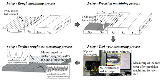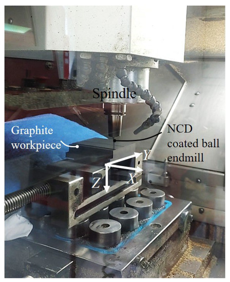 As shown in Figure 3, the diamond-coated ball endmill was equipped on the spindle, and the graphite workpiece was fixed to the vise of the XY-axis feed stage. As mentioned earlier, this research aims to analyze impact of the thickness of the coating on the abrasion and the machining performance of the ball endmill. Therefore, the cutting condition was fixed, the abrasion of the tool was measured for each certain cutting length, and, subsequently, the variation in roughness of machined surface was analyzed.