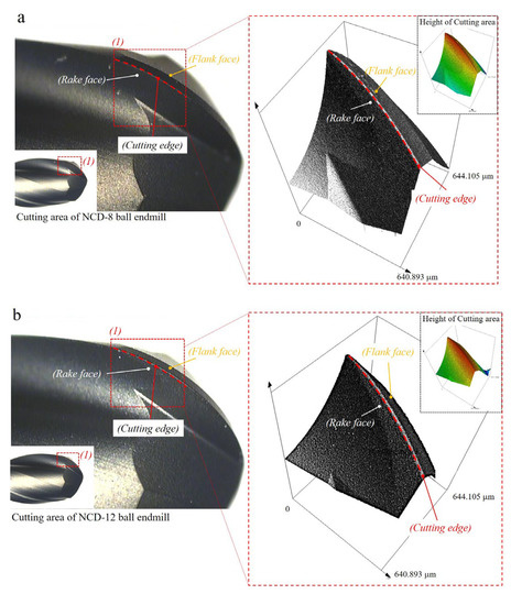The impact of the NCD coating thickness on the ball endmill abrasion and roughness of the machined surface were analyzed. The analysis of the abrasion tendency of the side and tip of the cutting edge showed that the abrasion of the cutting edge due to the coating thickness difference exhibited different patterns at the tool tip and on its side. In the case of machined surface roughness, it was observed that a thicker coating was more favorable for rough machining, and a thinner coating thickness was more favorable for precision machining. The impact of NCD coating thickness for the results of this study was analyzed relevant to the following two facts: First, the change in coating thickness affected the delamination abrasion at the interface; thus, a difference in abrasive behavior was observed at the flank and rake faces and the tool tip. Second, the variation in coating thickness affected the surface roughness of coating layer, which further altered the machining performance of the two NCD-coated ball endmills.
