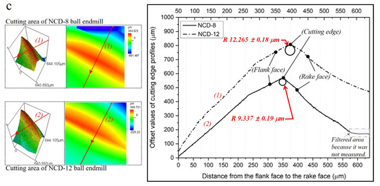 To analyze the effect of increasing the NCD coating thickness on tool abrasion and machinability, the coating surface and the change in the cutting-edge radius of the ball endmill according to the coating thickness were observed before the machining tests. An optical microscope and a 3D confocal laser microscope were used to observe and analyze the coating surface. Figure 5a,b are the optical microscope images at 76 and 148 times magnification (inside red dot of box). In the 8 μm-thick NCD coating (Figure 5a), compared to its 12 μm-thick counterpart (Figure 5b), the boundary of the cutting face from the endmill is more defined and the cutting edge is relatively sharper. This can be identified through the measurement of the cutting edge curvature. Figure 6 shows the measured results of the radius of the cutting edge using the analysis tool after 3D scanning, which was performed using a 3D confocal laser microscope. Including the measurement uncertainty at the 95% confidence level, the results were R 9.337 ± 0.18 μm and R 12.265 ± 0.19 μm each. Here, the curvatures measured for the 8 μm and 12 μm coating thicknesses were 0.107 ± 0.0018 (1 μm−1) and 0.082 ± 0.0012 (1 μm−1). Qin et al. [5] and Aslantas et al. [16] reported that the increase in coating thickness or the existence of coating increased the cutting edge radius, and, in this study, identical results were obtained.