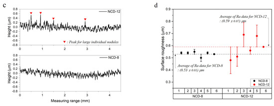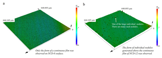 The surface roughness of the cutting area of tool was another factor that varied according to the coating thickness. The surface was scanned using a 3D confocal laser microscope, and the impact of the coating thickness was analyzed with the centerline average roughness (Ra) data obtained with a contact type surface profile meter. As shown in Figure 7a, individual nodules were uniformly distributed by forming continuous films throughout the surface with an 8 μm thick coating. In contrast, individual spherical or hemispherical nodules that were few μm in size were dispersed throughout the continuous and uniform (NCD-12) surface coated with 12 μm thickness (Figure 7b). This can be confirmed from the surface roughness profile (Figure 7c) and the deviation of Ra value (Figure 7d). In the surface profile of the NCD-12 sample, high peaks (indicated as red inverse triangles) appeared intermittently, and the range of Ra deviation of the two samples was −0.03–0.02 and −0.09–0.11. Here, the average Ra values were confirmed to be 0.53 ± 0.01 μm and 0.59 ± 0.07 μm, respectively, including measurement uncertainty when measured at the 95% confidence level. From this result, the individual nodules collected in one or 2–3 concentrations according to the coating thickness were distributed and developed on the continuously combined nodules to change the surface roughness.