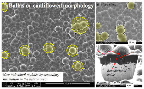 According to Kulisch et al. [19], NCD coating forms a “ballas” or “cauliflower-like” form as the individual spherical nodules increase with increasing deposition time, grow radially, and, finally, merge. According Kulisch et al. [19] and Lux et al. [20], this is due to the low primary nucleation density and high secondary nuclear growth rate of NCD. The nucleation density of the diamond in most substrates is significantly low due to its high surface energy. Therefore, individual crystals are primarily sporadically created on the pre-processed substrate. Eventually, as these individual nodules grow thicker than the nodule diameter due to the high secondary nuclear growth rate of NCD, they merge as microtwin structures and form a continuous film (see white area of surface view in Figure 8). According to Barbosa et al. [21] and Williams et al. [22], the generated diamond film is mainly composed of SP3 carbon, but may contain non-diamond carbon composed of several bonding configurations (SP, SP2) and disordered carbon depending on the deposition environment. In the case of the nanoballas’ structure, grain boundaries of non-diamond carbon surround the nanograins of SP3 carbon, and, in the case of the cauliflower structure, it has been described that it is more similar to columnar microcrystalline diamond. Additionally, these non-diamond carbons facilitate the regeneration of nanonuclei at the boundary.