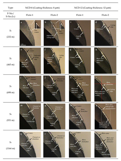 Flank and rake abrasion change in NCD tool according to cut length for each coating thickness: (a–d) S1, (e–h) S2, (i–l) S3, (m–p) S4, (q–t) S5.