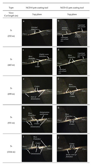 Flank and rake abrasions observed using the top views of NCD−8 μm and NCD−12 μm coated tools according to cut length: (a,b) S1, (c,d) S2, (e,f) S3, (g,h) S4, (i,j) S5.