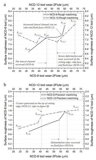 In rough machining, the initial surface roughness from the 12 μm coating endmill was higher by approximately 10% than that of the 8 μm coating, despite the abrasion width being smaller in the flank face. After the delamination from the 8 μm coating endmill (S2), the roughness of the machined surface had reversed, but the surface roughness of the 12 μm coated endmill machining rapidly increased again after S4, and similar roughness values were observed in both cases after the machining was complete. In precision machining, the surface roughness of the 12 μm coated ball endmill machining continuously remained higher than that of the 8 μm coated ball endmill machining over the entire cutting length. The machined surface roughness rapidly increased between S2 and S3, where crater abrasion occurred at the tool tip. The machined surface roughness of the 8 μm coated ball endmill rapidly increased between S3 and S4, where the occurrence of coating delamination initiated in the flank face.