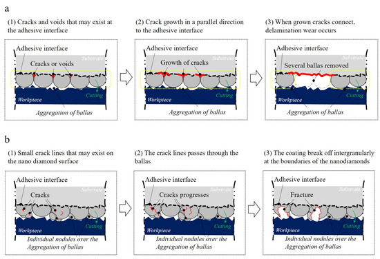 In general, it is known that the stronger the adhesion between the interfaces the longer the tool’s lifespan is, as the coating thickness increases. Through turning machining experiments of the insert tip coated with various thicknesses of nano-diamonds, Qin [5] found that the fastest delamination occurred in the case of lower coating thickness of 4 μm and reported that the tool abrasion and beginning of coating delamination varied according to the coating thickness. This was attributed to the elongated tool lifespan before delamination due to the increase in cutting load capacity as the coating thickness increased. Thus, thicker coatings were unfavorable for brittle fractures due to crack propagation from the high tensile strength of the substrate, but the critical load for delamination at the interface increased due to delayed initiation of plastic yielding. In our previous research, delamination had also been delayed through the micro scratch test in the MCD coating ball endmill with high adhesion strength between the interface [3]. Through this, it had been identified that the increase in coating thickness delayed the beginning of the delamination of the coating and affected the tool’s lifespan before the coating delamination started.