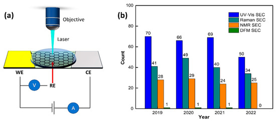 Since the coupling of spectroscopy and electrochemistry (hereafter spectroelectrochemistry (SEC)) can provide a detailed and comprehensive study of the electron transfer kinetics and analytes’ structural information during the electrochemical process. SEC is attracting intensive interest for various research in analytical fields, ranging from biology [1] to chemistry [2], material engineering [3,4], and others [5]. The schematic diagrams of the SEC technique are shown in Figure 1a. Electrochemical techniques, such as cyclic voltammetry (CV), differential pulse voltammetry (DPV), or electrochemical impedance spectroscopy (EIS), have been employed in SEC techniques [6,7]. Similarly, ultraviolet-visible (UV-Vis), Raman/surface-enhanced Raman spectroscopy (SERS), and nuclear magnetic resonance (NMR) are frequently used spectroscopy techniques. Therefore, SEC techniques have incredible versatility because multiple electrochemical methods are available and different spectral regions can be analyzed depending on the system under study, and the desired information to be obtained [8,9,10]. SEC techniques have been used to determine small structural changes and tiny luminescent responses [6,11]. Some of the examples include comprehending the electron transfer kinetics between the electrode and different electrolyte matrices [12], mass transport [13], and redox events for analytes and nanoparticles (NPs) [13,14].