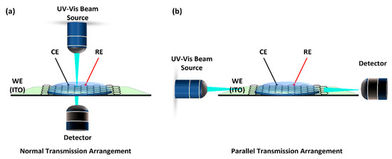 Based on the arrangement of the light source, the UV-Vis SEC can be roughly divided into two categories, that is, the normal transmission arrangement (Figure 2a) and parallel transmission arrangement (Figure 2b). When the light beam travels perpendicular to the WE surface in the normal configuration, it collects information about the solution and the WE. However, only the solution is sampled when the light beam is parallel to the WE (parallel transmission arrangement) [28]. For the normal transmission arrangement, since the light source needs to penetrate though the analyte solution and the WE, therefore, in this case, OTEs are fundamental for the success of the UV-Vis SEC and a topic of intense research. This drastically reduces the number of WE that can be used. On the other hand, a perfect but difficult alignment of the light beams is required in the parallel configuration. However, in practice, this means that many different parts must be assembled to carry out a single experiment [19].