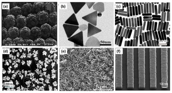(a) SEM image of an ordered hollow Au/Ag nanostructured film. Reprinted from [89], with permission from ACS Publications. (b) TEM image of Ag triangular nanoplates. Reprinted from [90], with permission from Elsevier. (c) TEM image of Au nanorods (AuNRs). Reprinted from [91], with permission from ACS Publications. (d) SEM image of Ag nanoflowers (AgNFs)/Graphene/Copper (Cu). Reprinted from [92], with permission from Elsevier. (e) SEM image of Ag/WO3-x nanoflakes. Reprinted from [93], with permission from Elsevier. (f) SEM image of Au nanostripes. Reproduced under the terms of CC BY licensed from [94].