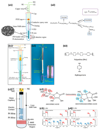 (a1) Schematic structure of the electrochemical cell designed for in situ EC-NMR experiment. (a2) Reaction mechanism of ethanol oxidation on Pt/MoS2/GNS. Reprinted from [77], with permission from Elsevier. (b1,b2) Electrochemical cell designed for in situ EC-NMR; (b3) The molecular structure of polyaniline (PAn) and hydroquinone (QH2). Reprinted from [11], with permission from Elsevier. (c1) Electrochemical cell and electrodes. The WE, CE, and RE are fixated on the glass capillary tube. (c2) The different hydrogen atoms observed in the NMR spectra are highlighted. In addition, the 1H NMR spectra of the oxidation of ascorbic acid in situ (c3) and ex situ (c4) are shown. Reprinted from [78], with permission from Elsevier.