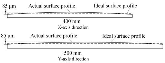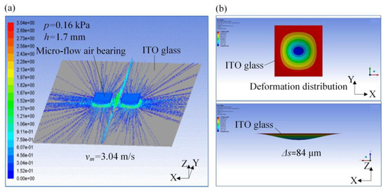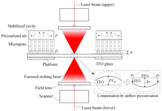 - A micro airflow array pressurization was proposed in a double-sided laser etching process by using a micro-airflow air bearing. The surface underwent positive pressure by loading the airflow pressure and adjusting the etching gap to position the machined surface. The micro-deformation generated by the micro-stress was able to compensate the initial flatness of the workpiece within critical pressurization parameter. This was beneficial for improving the flatness of the ITO glass during the etching process.