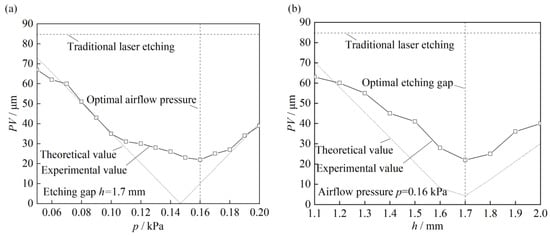 - The airflow pressure and etching gap showed a trend of first decreasing and then increasing with respect to the workpiece flatness. Within the critical airflow pressure range, the pressure applied on the surface of the workpiece was sufficient to hold it down without causing excessive micro-deformation. When the airflow pressure was in the range of 0.11–0.18 kPa and the etching gap was in the range of 1.6–1.8 mm, the optimal pressure on the workpiece surface was 15.2–15.7 Pa and the flatness after etching is 22 μm, which was a decrease of 74%.