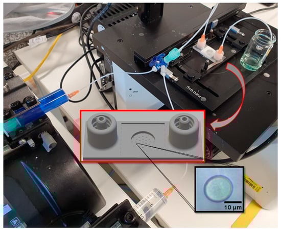 Experimental set-up consisting of inverted microscope with video monitoring, microfluidic swelling cell, syringe pumps for the repeated swelling cycle—experiments.
