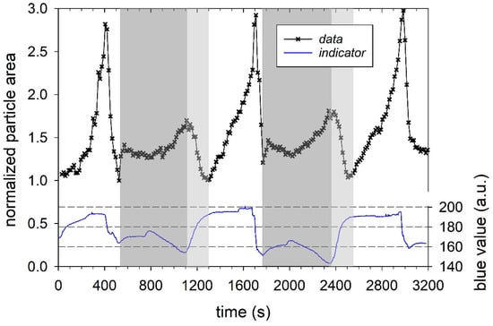 Swelling/de-swelling cycles of a single casein microparticle induced by pH-jumps. The blue value of the indicator shown below indicates the repeated pH progression between pH 11 and pH 1 and back again. Gray areas indicate the time between cycles, which were not considered for further analysis.