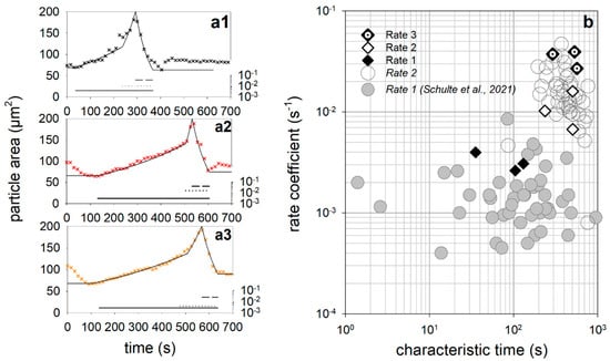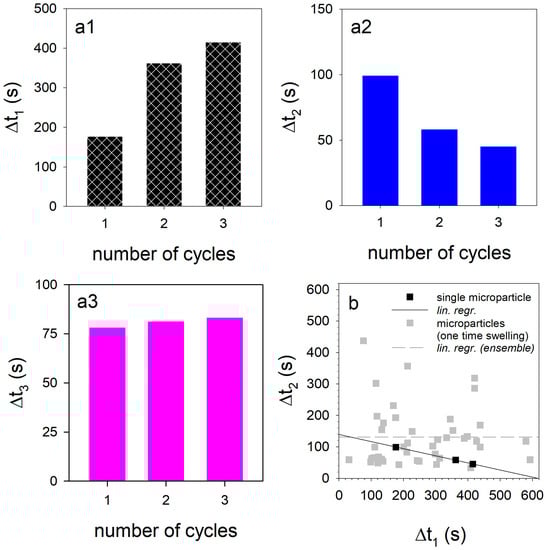 Figure 7a1–a3 shows how the duration of the swelling/de-swelling steps changes from cycle to cycle. The duration of the first step increases from 180 s (first cycle) to 360 s (second cycle) to 400 s for cycle 3. In contrast, the time of the second swelling step decreases from 100 s via 60 s to 45 s, while the duration of the third de-swelling step remains almost unchanged at approx. 75 s. The time intervals of the first two swelling steps for the three cycles are almost perfectly negatively correlated (black dots and solid line in Figure 7b). A short first swelling step causes a longer second swelling step and vice versa. The swelling of the microparticle would theoretically take only about 140 s without swelling step 1, but 620 s without swelling step 2, as Figure 7b indicates. In contrast, no such correlation could be found for casein microparticles when only one swelling cycle was performed. We have already investigated the influence of different drying conditions on swelling and the subsequent decomposition on 32 individual microparticles at pH11 in a statistical analysis [].
