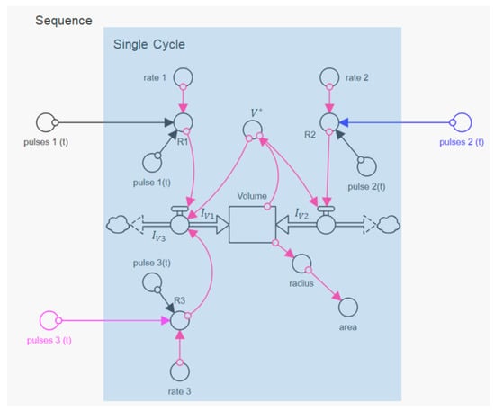 We first analyzed the three swelling peaks in Figure 2 individually, using the data in the unmarked time intervals in Figure 2. In these time intervals, the change of the pH value was first with aqueous NaOH solution at pH 11 and then with aqueous HCL solution at pH 1, as shown by the distorted square pulses of the corresponding indicator signal. All three swelling cycles in Figure 3a1–a3 show a two-step swelling process, with the second swelling step proceeding faster than the first. This observation is consistent with previous swelling experiments on casein microparticles [,]. Studies with the calcium chelator citrate have shown that calcium influences the first swelling step, while no such dependence exists for the second swelling step []. After reaching the maximum swelling value, an even faster de-swelling takes place in all cases, as a result of the pH jump by aqueous HCl solution. We simulated the individual swelling experiments with a systems dynamic model, which is shown in Figure 4. This is a sequential swelling model type, according to Schulte et al. [], which was extended for these special experiments by a third de-swelling step and pulse sequence functions.