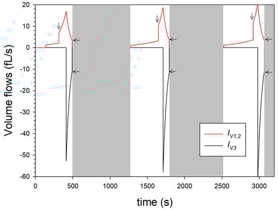 While the volume flows IV1,2 together reach maximum values of 15 to 20 pL/s during alkalinization, the volume outflow starting after acidification is significantly shorter and reaches maximum values of −50 to −60 fL/s. The jump in volume inflow (see vertical arrows) is particularly drastic and caused by the beginning of swelling step 2. When the maximum volume flow IV1,2 is reached, the pH drop inside the microparticle causes a de-swelling, which is modelled via the volume flow IV3. Due to the maximum volume expansion (V*), IV3 initially has maximum absolute values of approx. 50 fL/s and more according to the dynamic model in Figure 4 and then drops, similar to the swelling flow IV1,2, due to the shrinkage. At the beginning of the grey areas, the inflows and outflows (indicated by horizontal arrows) are not equal in absolute value, so that the microparticle has not reached a state of equilibrium at these times. The plot of the volume flow in Figure 6 also shows that, from cycle to cycle, swelling step 1 takes longer, while swelling step 2 is shortened, and de-swelling step 3 remains unchanged.
