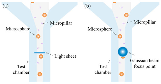 (a) Fluorescent micropillars and microspheres passing through a light sheet, and (b) fluorescent micropillars and microspheres passing through a Gaussian beam spot.