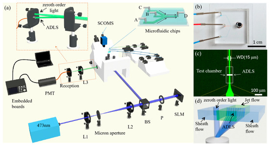 Schematic diagram of the ADLSFC system. (a) Schematic of the system. (b) Photo of the microfluidic chip. (c) Fluorescence image of the microchannel. The inlets A and C are injected with pure water, and B is injected with fluorescein sodium salt solution. All inlets have flow rates of 1. The width of the jet (WD) is 15 . D is the outlet. (d) Schematic diagram of the ADLS in the test chamber after focusing by the objective lens. Zeroth order light spot is separated with the modulated ADLS. The latter covers the entire jet flow, while the former is located in the sheath flow.