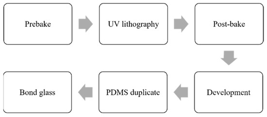 The microchannel is fabricated through soft lithography with polydimethylsiloxane (PDMS) [22,32] as according to the procedure shown in Figure 3. The channel layer is first fabricated using a negative photoresist SU-8 3025 on a silicon wafer. After 10 prebaking, the photoresist-coated wafer is exposed to UV light using a contact mask aligner (MIDAS, MDA400LJ, Daejeon, Republic of Korea). After post-baking (10 ) and development, the template is obtained. The structure of the template is subsequently duplicated using PDMS. The PDMS microchannel is further bonded onto a glass slide and punched with inlets and outlets to form the desired microfluidic chip.
