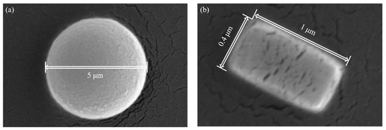 Subsequently, to verify the accuracy of ADLSFC for sample size measurement, we analyzed the measured particle size. As shown in Figure 10, the blue bars indicate the average diameters of micropillars and microspheres obtained by analyzing the FWHM of the fluorescence signals, and the yellow bars indicate the theoretical particle diameters. It can be seen the average of the micropillar from the experiments is 0.74 , while that of the theoretical data is 0.77 (estimated from the diagonal size of the micropillars measured in SEM). The results measured using ADLSFC are highly consistent with that using SEM. Thus, the validity of ADLSFC to detect and measure the size of submicron scale particles has been supported. In addition, the of the microsphere from the experiments is essentially consistent with the theoretical one. All these indicate that the ADLSFC can reliably evaluate the streamwise size of the particles at the moment of passing through the ADLS.