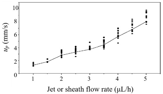 Fluorescent particle velocity varies with the jet or sheath flow rate. Here, . Each dot represents a measurement. The average velocity of the measurement is represented by the solid line.