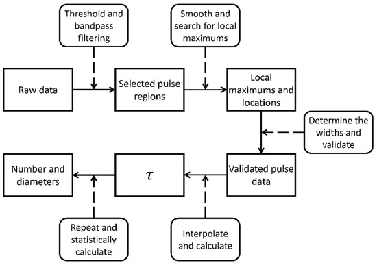 The data processing algorithm includes five main steps, as diagrammed in Figure 6. (1) The raw data are first processed with a threshold filter and a bandpass filter to remove noise and pick the pulse regions from the raw data. (2) These pulse regions are smoothed with a moving average algorithm and the local maxima is searched for in the pulse regions. (3) The widths of the pulses from their rising and falling edges are determined, then the pulse data are validated with the bandpass filter again. (4) The validated pulse data are interpolated to calculate the . (5) The process above is repeated, and the number and diameters of the particles are statistically calculate.