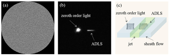 Given for each Bessel–Gaussian beam, the ADLS formed by aligned Bessel–Gaussian beams can be generated. To achieve a uniform ADLS in the experiment, nine Bessel–Gaussian beams are generated and arranged in parallel at an interval of 8λ. The BG array is generated via an SLM, with the phase map designed according to the strip segmentation phase (SSP) method [27], with a blazed grating superposed (Figure 7a). In order to calibrate the dimensions of the ADLS directly, a thin film of fluorescein sodium salt solution (SIGMA, 46970-100G, Roedermark, Germany) coated on a coverslip with 50 concentration has been used. Its thickness is 2 . By moving the calibration film vertically, the structure of the ADLS is visualized layer-by-layer using a SCMOS camera. From Figure 7b, it can be seen that the zeroth order light has been distantly moved from the modulated beams, showing negligible influence on the fluorescent measurement. The 3D distribution of ADLS was reconstructed using Matlab software, as shown in Figure 7c. The ADLS is 12 wide, 12 high, and 0.8 thick if a 20× NA 0.4 lens is applied. It is sufficiently large to cover the entire jet flow. The ADLS has a good uniformity. The standard deviation of the thickness is about 0.18 .