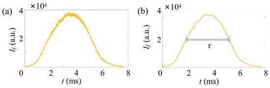 First, the fluorescent micropillar with a relatively high concentration () is applied. A typical time trace of the fluorescence signal () is plotted in Figure 8a for the measurement of fluorescent micropillars. It can be seen the raw fluorescent signal contains a large amount of noise, including optical noise, instrumental thermal noise, and electromagnetic noise. The presence of noisy signals can generate analysis errors on the FWHM of the pulse. Thus, a series of denoising methods have been applied to remove noise.
