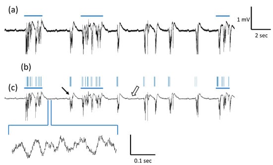 Figure 1 shows a representative a-SiC MEA continuous recording one-week post-implantation. Figure 1a shows raw continuous signal. Figure 1b shows continuous signal after applying the 500 Hz low pass-filter to observe the LFP band. Traces show intermittent 1–2 mV amplitude, multiphasic waveforms lasting less than 1 s (black arrow). As highlighted by comparing Figure 1b,c, multiphasic waveforms were largely coincident with multi-unit bursting (blue horizontal line), which shows the low-pass and band-pass filtered data aligned. In addition, recordings showed lower amplitude oscillations of approximately 20–50 µV peak-to-peak (white arrow).