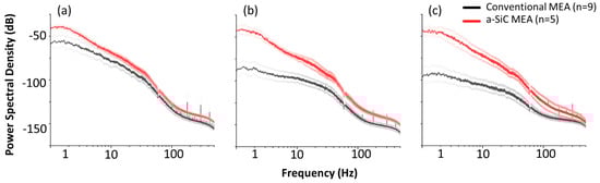 Comparative power spectral densities (PSD) for a-SiC MEAs and conventional planar, silicon-based devices. PSD (a) 1 week, (b) 7 weeks, and (c) 16 weeks post-implantation for conventional and a-SiC MEAs. Bold red (a-SiC) and grey (conventional) traces represent the mean and light traces represent the standard error of the mean.