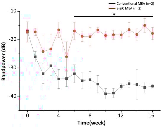 Total LFP bandpower recorded from a-SiC and conventional MEAs for up to 16-weeks post-implantation. The span of the horizontal bar shows that statistical significance between a-SiC and conventional MEAs was achieved at all timepoints under the bar, from week 6 post-implantation to week 16. Data reported as mean ± SEM; statistical significance: * p < 0.05.