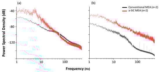 Comparative power spectral densities (PSD) for a-SiC MEAs and conventional devices. In awake, freely moving rats. Average PSD for a-SiC (n = 2) and conventional MEAs (n = 2) at (a) 1 weeks (b) and 16 weeks post-implantation.