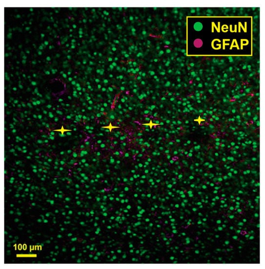 Pilot histological analysis a-SiC MEA (n = 1). Green represents neuronal nuclear antigen (NeuN) and magenta represents glial fibrillary acidic protein (GFAP). The yellow stars represent the putative implant location for each one of the four shanks.