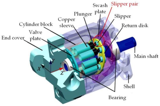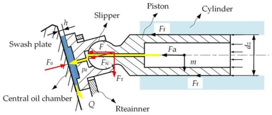 - Gaston, H.; Wang, D. Analysis of Damage and Failure mechanism under a lubricated slipper/swashplate interface in Axial Piston Machines. Sci. Direct 2022, 35, 124–131. [Google Scholar] [CrossRef]
