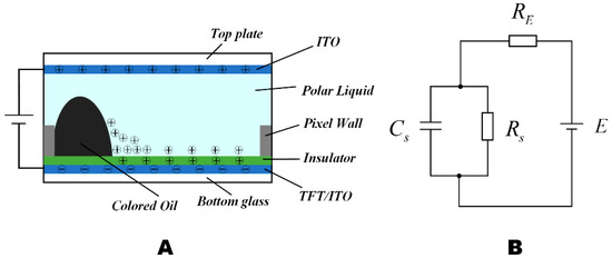 The EWD structure and its simplified equivalent circuit diagram. (A) Side view of EWD pixel structure under an electric field. (B) A simplified equivalent RC circuit model of EWD pixels.