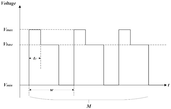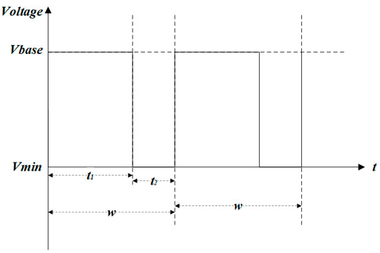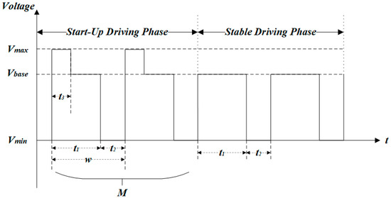 The multi-DC driving waveform for gray scale consistency is composed of a start-up driving phase and a stable driving phase. As shown in Figure 2, the stable driving phase is constituted of a square waveform with a period w. The start-up driving phase consists of a number of start-up driving waveforms where is a driving time of the overdriving pulse, is the max driving voltage, and is the effective driving voltage. is the period of a waveform, which is composed of the effective driving time and the charge deintercalation time . The pixel could be switched on by voltage driving at and release charges in the insulation layer at to obtain a stable gray scale. This is inspired by Zeng [27], Long [39], and Chiu [23], who decrease the pixel response time and inhibit the oil splitting of EWD based on an overdriving waveform; however, the gain effect of each parameter of the overdriving waveform was not described in detail. Therefore, the related characteristics of our proposed driving waveform need to be further studied.