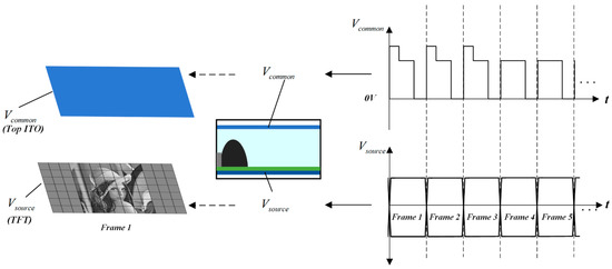 The proposed driving waveform was applied to the TFT-EWD, as shown in Figure 3. A voltage signal was provided by for the common pole of the TFT-EWD. was the voltage signal of image pixels in the TFT panel. The image could be displayed on the TFT-EWD by the combination of and . Compared with the ITO-EWD, a source driver integrated circuit chip (IC) and a gate driver IC from UltraChip corporation in Taipei, Taiwan, and TFT structure could be used at the TFT-EWD to lock the pixel voltage, in order that the pixel capacitance value could be changed. The proposed driving waveform was adjusted by the structural changes in this paper. As shown in Figure 3, in the start-up driving phase and the stable driving phase, the waveform of each period corresponds to a frame of an image, in order that the low-gray image could be displayed. The details of the image could be displayed by this method.