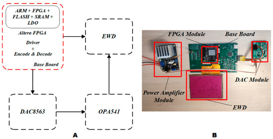 To evaluate the effectiveness of the driving waveform, an EWD driving waveform experiment system was designed. As shown in Figure 4, the system was composed of a field programmable gate array (FPGA) module, a base board, a digital-to-analog conversion (DAC) module, and a power amplifier module. Altera’s EP4CE75F23C8 was selected as the core control chip of the EWD driver. A DAC8563 was used as a digital-to-analog conversion module to generate an arbitrary driving waveform. An OPA541 operational amplifier was used as a power amplifier module for signal amplification. The signal interface between the various modules was provided and connected by the base board.