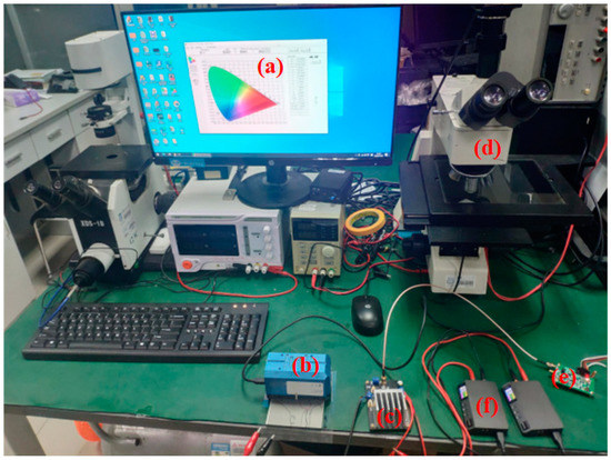 In order to evaluate the validity of the driving waveform, two experimental platforms were built. Figure 5 was a luminance and aperture ratio testing platform. (a) was a computer for receiving and processing data. (b) was a colorimeter for detecting EWDs’ reflected luminance. (c) was a power amplifier module for signal amplification. (d) was a microscope for observing the EWD’s pixel structure. (e) was a digital-to-analog conversion module for EWD driver control signal conversion. (f) were power supply units. All experiments were conducted at room temperature of 25 °C and 53% humidity.