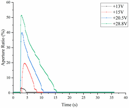 To understand EWD aperture ratio characteristics, the EWD was tested with a single DC voltage in this paper. As shown in Figure 6, +13 V, +15 V, +20.5 V, and +28.8 V DC voltages were continuously accessed to the EWD for experiments, and the maximum aperture ratio was 51.43% when a +28.8 V single DC voltage driving waveform was applied. The higher the DC voltage, the longer was the backflow time. The oil could turn over the pixel wall when the voltage exceeded +30 V; therefore, in order to ensure that the pixel works, the driving voltage must be below 30 V.