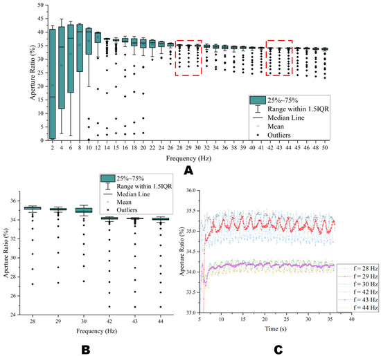 Fluctuations in EWD aperture ratio at different frequencies. (A) The EWD aperture ratio box diagram when = 20.5 V, = 11.63 ms, and the frequency was from 2 Hz to 50 Hz. (B) The aperture ratio box diagram at 28 Hz, 29 Hz, 30 Hz, 42 Hz, 43 Hz and 44 Hz when = 20.5 V, = 11.63 ms. (C) The aperture ratio and time relationship diagram at 28 Hz, 29 Hz, 30 Hz, 42 Hz, 43 Hz, and 44 Hz when = 20.5 V, = 11.63 ms.