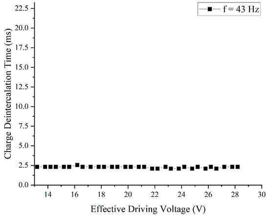 When using 43 Hz as the frequency of the waveform, needs to be determined to stabilize the display of the pixel. In this paper, was defined as the deintercalation time, releasing the charge deintercalation in the insulation layer. To further study the relationship between and , an ITO-EWD was used for testing, and the minimum charge deintercalation times under different voltages were tested respectively. By observing EWD pixels driven by , gradually increased from 0 ms until the pixel aperture ratio reached the maximum value, and no oil backflow occurred. At this point, was the minimum charge deintercalation time at . As shown in Figure 9, when the frequency was 43 Hz and the voltage was 0 V, the minimum charge deintercalation time was independent of the and tended to be a constant. The average minimum charge deintercalation time of the ITO-EWD was 2.28 ms. Therefore, 2.28 ms was defined as the minimum charge deintercalation time of the ITO-EWD. To enhance the stability and compatibility of the driving waveform, the driving waveform increased by more than 10% of the cycle as the margin of the deintercalation time; therefore, 4.88 ms was used as the stable deintercalation time.