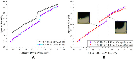 The relationship between the and aperture ratio. (A) The aperture ratio of the ITO-EWD was tested when the increased from 13 V to 28.8 V. (B) The aperture ratio of the ITO-EWD was tested when the voltage increased from 13 V to 28.8 V and decreased from 28.8 V to 13 V.