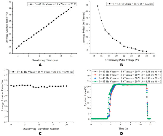 Influence of parameters of the overdriving waveform on the aperture ratio. (A) When = 43 Hz, = 15 V, = 20 V, the relationship between and aperture ratio. (B) When = 43 Hz, = 15 V, = 3.72 ms, the relationship between and average switch on time. (C) When = 43 Hz, = 15 V, = 20 V, = 3.72 ms, the relationship between and aperture ratio. (D) When = 43 Hz, = 15 V, = 20 V, = 6.98 ms, the relationship between time and aperture ratio for different numbers of waveforms.