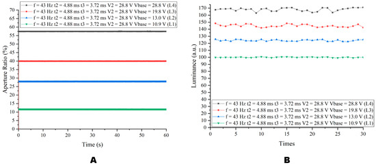 Aperture ratio and luminance at four levels. In the case of = 43 Hz, = 4.88 ms, = 3.72 ms, and = 28.8 V, four levels of gray scales could be achieved by changing . (A) Aperture ratio at four . (B) Luminance at four .