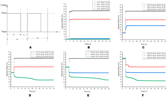 Figure 14 shows the change in the aperture ratio when switching the gray scale under a square wave. Figure 14A shows the square wave used in the experiment, and its relevant parameters were = 23.26 ms ( = 43 Hz), = 4.88 ms, and = 18.38 ms. As could be seen in Figure 14B, the voltage from 0 V to the L1 and L2 gray scale could not penetrate the oil and the pixels could not be opened. It could be seen from Figure 14 that when the gray scale decreased from the high gray scale to the L1 gray scale, it took a long time to achieve a stable aperture ratio.