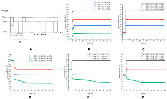 A change in switching between four gray scale levels driven by a square wave. (A) The square wave driving waveform experiment diagram. (B) The curve of the aperture ratio when changed from 0 V to L1~L4. (C) The curve of the aperture ratio when changed from L1 to L2~L4. (D) The curve of the aperture ratio when changed from L2 to L1, L3, and L4. (E) The curve of the aperture ratio when changed from L3 to L1, L2, and L4. (F) The curve of the aperture ratio when changed from L4 to L1~L3.