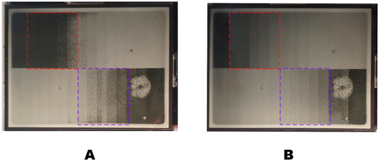 Each driving waveform was applied to a TFT-EWD to display gray scales, the red and purple squares show the difference of grayscale display under different waveforms. (A) The EWD driving by a 15 V DC driving waveform. (B) The EWD driving by a multi-DC driving waveform.